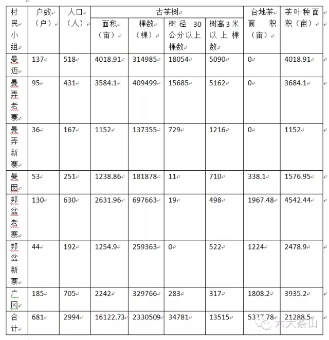 千百年來(lái),人們似乎對(duì)賀開十分熟悉,卻又如此陌生。歷史仿佛為賀開留下一段遺憾。讓我們看一組吸引眼球的古茶樹統(tǒng)計(jì)數(shù)據(jù)吧:曼邁314985棵、曼弄老寨409499、曼弄新寨137355、曼囡181878棵、邦盆老寨697663棵、邦盆新寨259363棵、廣岡329766棵,合計(jì)2330509棵。
