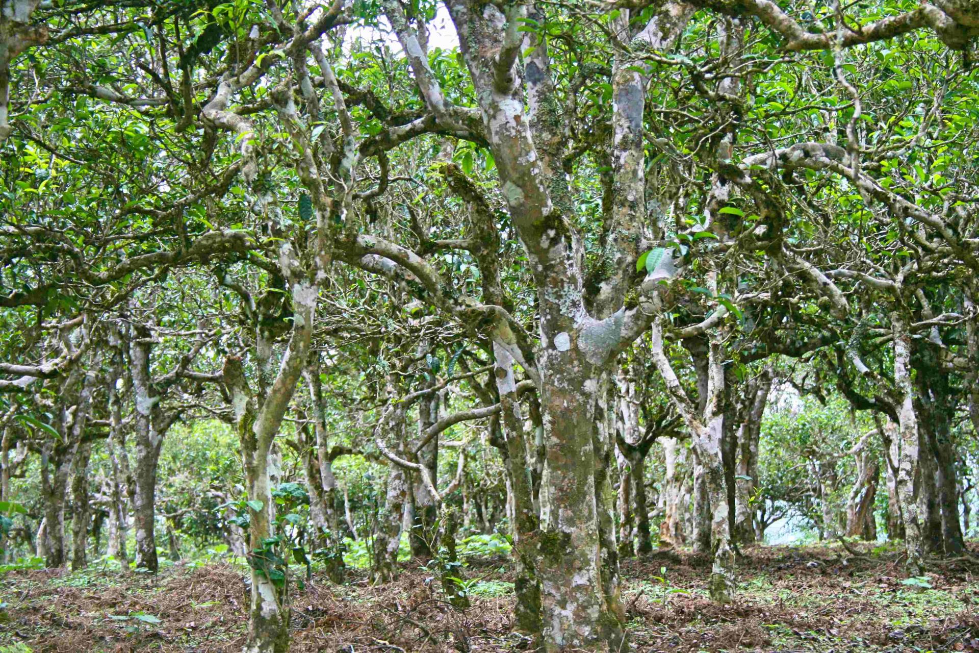 在賀開古茶山,古茶樹平均密度一般在132株/畝左右,基部圍0.82米左右,樹幅約3*2.5米,樹高平均在2.5米。管理上不施任何化肥、農(nóng)藥,僅除去茶園中的高草,平均單產(chǎn)30千克/畝。在海拔1600米的曼弄新、老寨交界處生長(zhǎng)著10多株大茶樹,是賀開“茶王”樹的圣地。其中一株最大的古茶樹,樹型喬木,樹高3.8米,樹幅7.3*6.55米,基部圍2.12米,樹齡1300年左右,被當(dāng)?shù)厝朔Q為“茶王”。古茶樹生長(zhǎng)在村寨附近樹木茂盛、陰覆良好的自然環(huán)境中。還有的生長(zhǎng)在村民的房前屋后,古茶樹長(zhǎng)勢(shì)旺盛,構(gòu)成了一幅“林中有茶,茶在寨中”人與自然和諧的古茶園景觀。